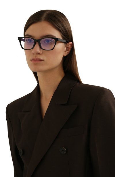 Тонкую оправу произвели из легкого ультрапрочного титана с покрытием цвета белого золота, долго не теряющим блеск. Рамки сверху подчеркнули черными вставками, в тон которым – заушники. Эти детали выполнили из полированного черного ацетата, всегда остающегося теплым на ощупь.