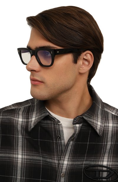Черные квадратные очки изготовили из отполированного до глянцевого блеска ацетата Mazzucchelli, превосходящего аналоги в легкости и прочности. Такой аксессуар с заклепкой в форме полукреста почти ничего не весит, поэтому не вызовет усталость при длительном ношении. Рамку и ободы соединили с помощью пятиствольной петли, обеспечивающей плавность хода.