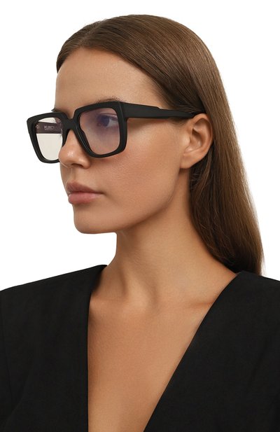 Черные квадратные очки изготовили из отполированного до глянцевого блеска ацетата Mazzucchelli, превосходящего аналоги в легкости и прочности. Такой аксессуар с заклепкой в форме полукреста почти ничего не весит, поэтому не вызовет усталость при длительном ношении. Рамку и ободы соединили с помощью пятиствольной петли, обеспечивающей плавность хода.