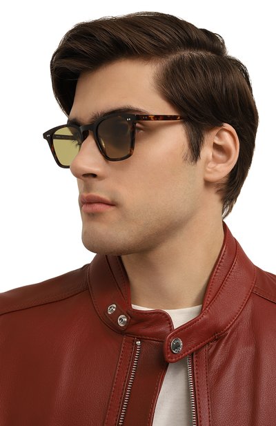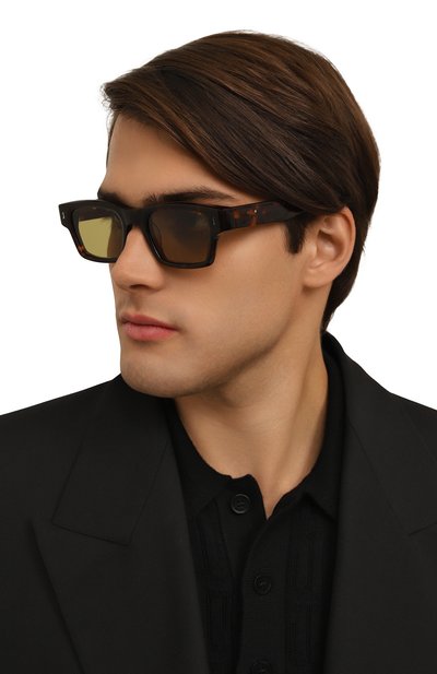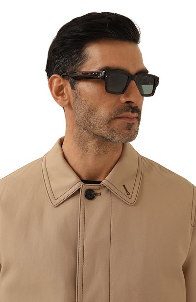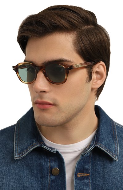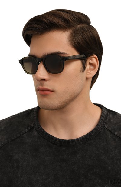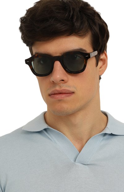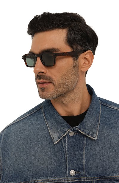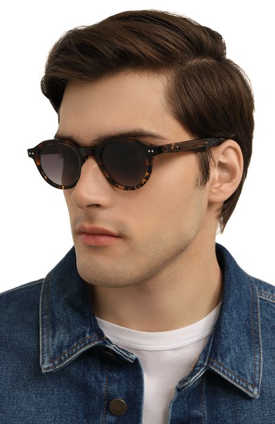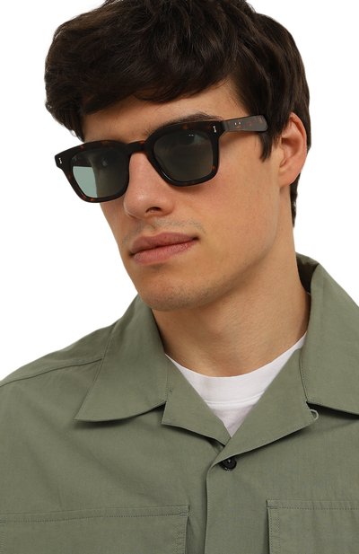 Оправа солнцезащитных очков изготовлена вручную из ацетата Mazzucchelli. Дужки с 5-цилиндровыми шарнирами украшены фирменными заклепками. Аксессуар дополнен линзами с антибликовым покрытием.