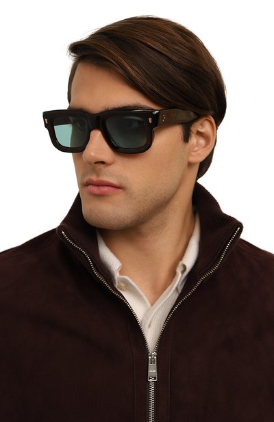 Солнцезащитные очки Lando изготовили вручную из легкого пятнистого ацетата Mazzucchelli. Аксессуар с запатентованными шарнирами и фирменными серебристыми заклепками дополнили линзами с антибликовым покрытием.