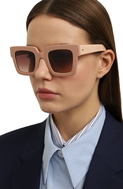 Для создания солнцезащитных очков cat eye пастельно-розового оттенка использовали гладкий легкий ацетат, который не боится царапин и трещин. Узкие дужки с круглыми заушниками усилили металлическими вставками. Градиентные линзы на 100% блокируют ультрафиолетовое излучение, не искажая цветовосприятие.