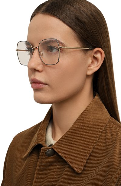 Золоти стое покрытие на узкой оправе из прочной нержавеющей стали соседствует с черной эмалью, которая обрамляет квадратные демонстрационные линзы. С контрастным финишем зарифмовали заушники из легкого глянцевого ацетата. Единственный декор – миниатюрная литера «C», выгравированная на дужках.