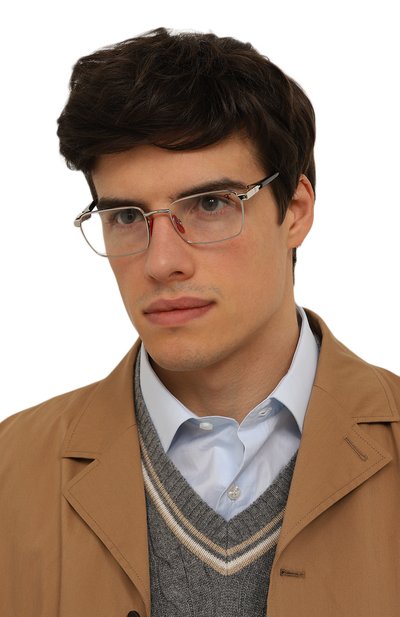 Лаконичную оправу в виде авиаторов изготовили из ультратонкой нержавеющей стали с серебристым покрытием. Аксессуар с двойным мостом дополнили силиконовыми подвижными носоупорами, поэтому он идеально сидит на лице. Узкие дужки с заушниками из легкого ацетата украсили выгравированным логотипом.