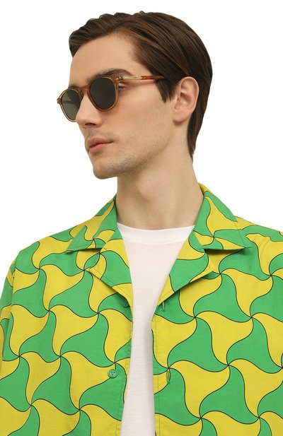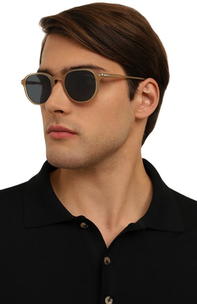 Для создания солнцезащитных очков янтарного цвета выбрали глянцевый полированный ацетат, сочетающий в себе легкость и прочность. Темные линзы, блокирующие ультрафиолет, выполнили из поликарбоната, который не боится царапин. По бокам ‒ вдохновленные птичьим крылом серебристые детали, символизирующие абсолютную свободу.
