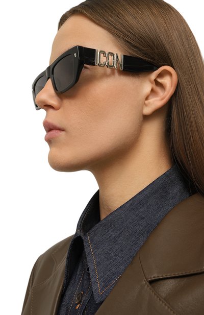 Для изготовления черных солнцезащитных очков квадратной формы использовали легкий глянцевый ацетат, который не разобьется при случайном падении. Дужки с вырезом в виде буквы D украсили накладкой в виде эмблемы. Модель с серыми градиентными линзами, полностью блокирующими ультрафиолет, подойдет и женщине, и мужчине.