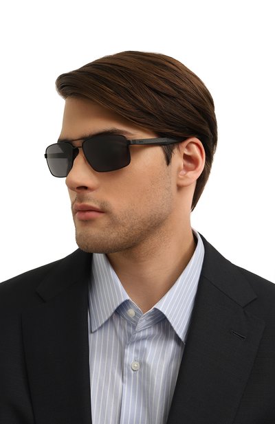 Для изготовления черных солнцезащитных очков использовали легкий ацетат, поэтому они почти не ощущаются на переносице. Теплый на ощупь материал тщательно отшлифовали, придав ему исключительную гладкость. Золотистые узкие накладки на дужках и краях рамок визуально создают единую конструкцию и добавляют аксессу ару деликатный блеск.
