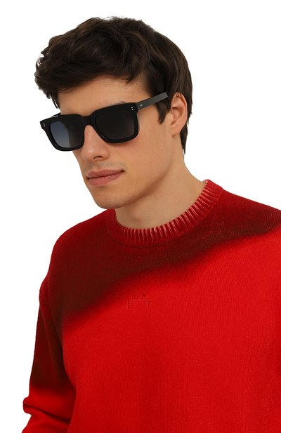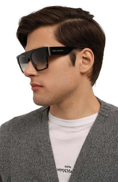 Черные солнцезащитные очки только выглядят массивно. Чтобы изделие получилось легким, для его создания выбрали ацетат, который почти ничего не весит. Низ рамки подчеркнули черепаховым узором, а широкие дужки дополнили золотистым логотипом марки.