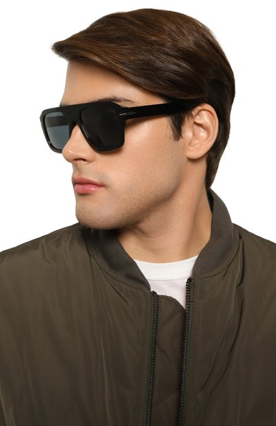 Черные солнцезащитные очки с плоскими линзами не пропускают 100% ультрафиолетовых лучей и снижают нагрузку на глаза. Массивная, но при этом легкая квадратная оправа аксессуара изготовлена из прочного глянцевого ацетата, устойчивого к царапинам и сколам. Рамка и широкие дужки украшены логотипами бренда.