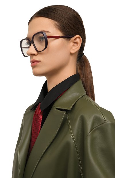 Для изготовления лаконичной синей оправы из коллекции Blush использовали разные по фактуре материалы. Крупную квадратную рамку выполнили из легкого глянцевого ацетата, а для фигурных узких дужек, наполовину окрашенных в персиковый оттенок, использовали прочный сплав.
