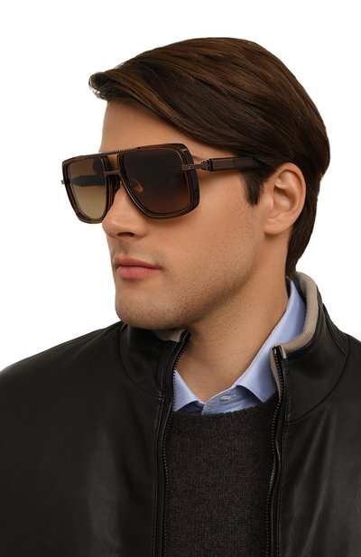 Солнцезащитные очки из титана дополнили ацетатными шорами с узором PB Labyrinth. Мост украсили логотипом марки, а дужки — фактурным орнаментом. Градиентные линзы с антибликовым покрытием обеспечивают 100% защиты от УФ-лучей.