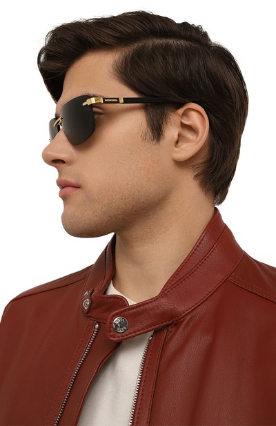Солнцезащитные очки Monsieur с ацетатными дужками впишутся как в женский, так и в мужской образ. Мост, носоупоры и шоры с фирменным узором изготовлены из позолоченного титана. Аксессуар дополнен поликарбонатными линзами, которые на 100% защищают от УФ- лучей.