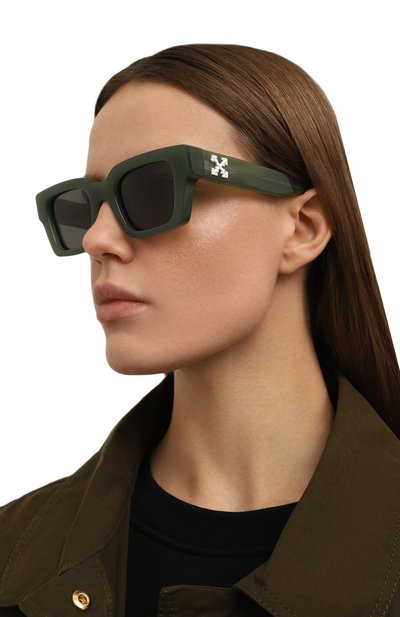 Солнцезащитные очки Meridiano изготовили из ацетата. Дужки украсили логотипом марки, в тон которому выполнили заушники с отверстиями для цепочки-шатлен.