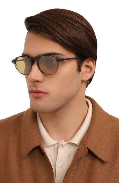 Металлическую оправу очков с матовым финишем дополнили гибкими петлями, а заушники из ацетата Mazzucchelli – внутренними нескользящими накладками из кожи. В мост встроили фирменный механизм, который позволяет развернуть одну из линз и дужку на 180 градусов для защиты от повреждений. Желтые линзы Zeiss надежно блокируют ультрафиолетовые лучи и световые блики.