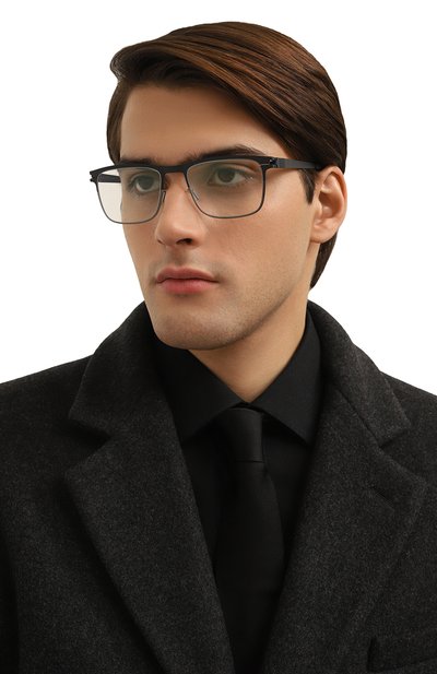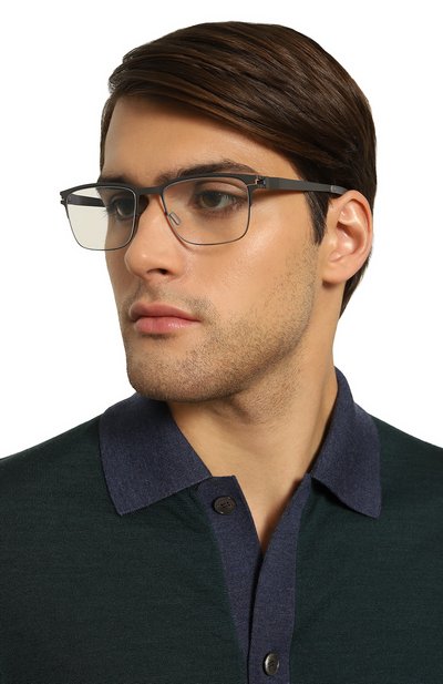Полуободковую металлическую оправу покрыли финишем цвета пушечной бронзы. Рядом с прямоугольными линзами разместили небольшие черные вставки. Такими же дета лями украсили дужки с логотипом марки и внутренней лазерной гравировкой. Ацетатные заушники дополнены брендированной пластиной.