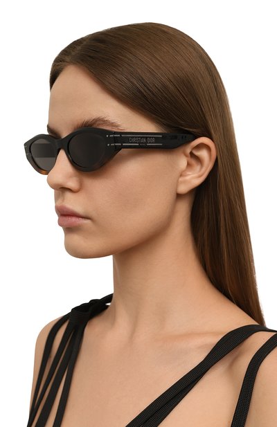 Черные солнцезащитные очки декорировали на широких дужках рельефным узором, повторяющим фирменный стеганый мотив Cannage. На заушниках разместили золотистую эмблему бренда. Для производства оправы использовали легкий ацетат с деликатным блеском. Темные линзы обеспечивают 100-процентную защиту от УФ-лучей.