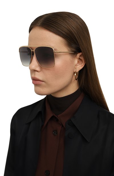Авиаторы с двойным мостом и узкими дужками изготовили из легкого прочного металла цвета желтого золота, а для заушников использовали прозрачный ацетат. На поликарбонатные линзы нанесли градиент в оттенках бутылочного стекла, поэтому аксессуар не снижает контрастность изображения.