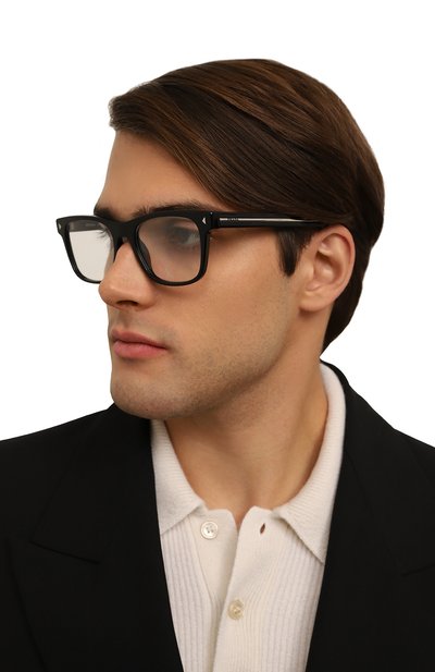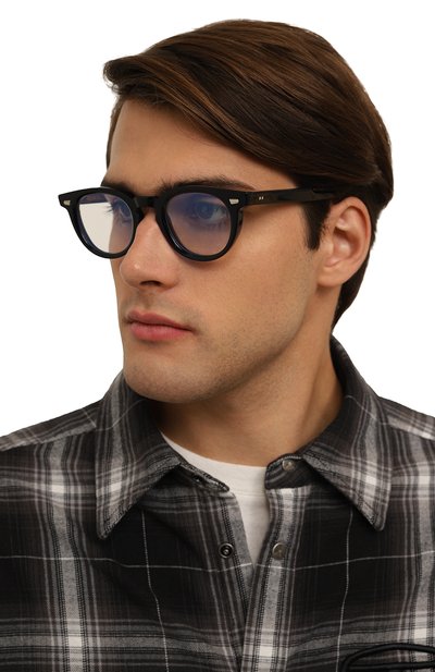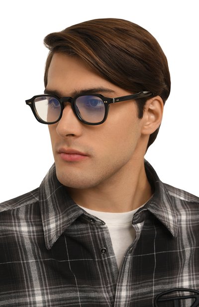 Черная оправа выполнена вручную из прочного японского ацетата, отполированного до идеальной гладкости и глянцевого блеска. Золотистые регулируемые носоупоры изготовили из практически вечного титана и декорировали гравировкой. Легкий аксессуар с узкими дужками дополнили позолоченными заклепками.