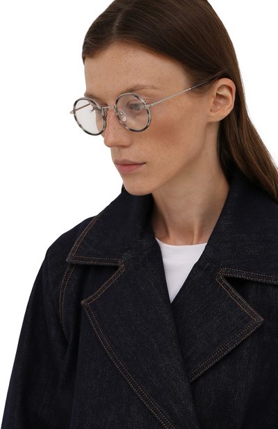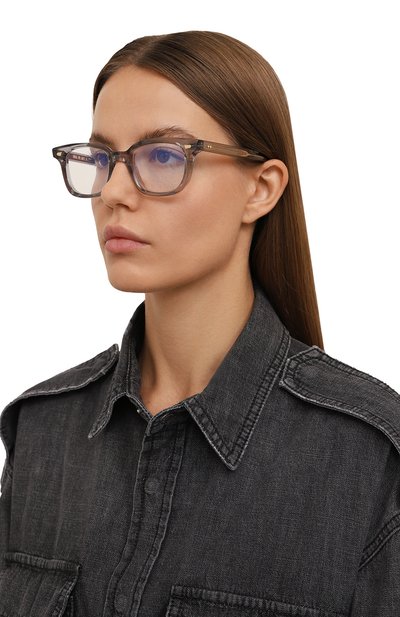 Для создания оправы Sagan-G использовали полупрозрачный ацетат с глянцевым блеском. Узкие дужки украсили логотипами бренда. Аксессуар дополнили регулируемыми носоупорами из титана.