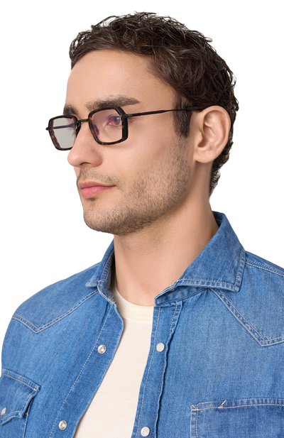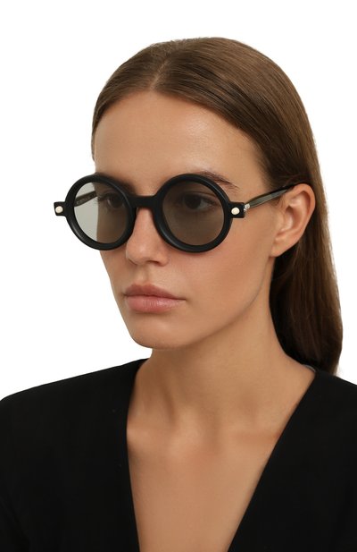 Для изготовления черных солнцезащитных очков с круглыми ободами, украшенными фирменными миниатюрными накладками, использовали прочный японский ацетат с особенно выраженным глянцевым блеском. Аксессуар с узкими дужками дополнили прозрачными линзами, которые не скрывают глаза и не снижают контрастность изображения. Модель одинаково подходит и мужчине, и женщине.