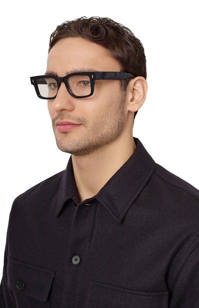 Квадратную оправу с неподвижными носоупорами выполнили из гладкого ацетата. Аксессуар украсили золотистым логотипом на широких дужках и полосками на заушниках.