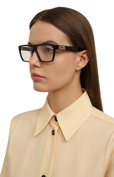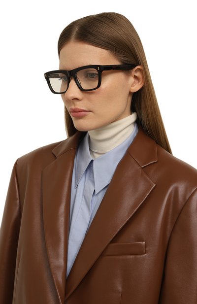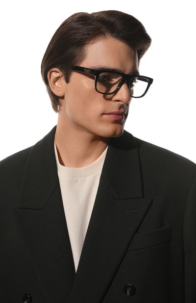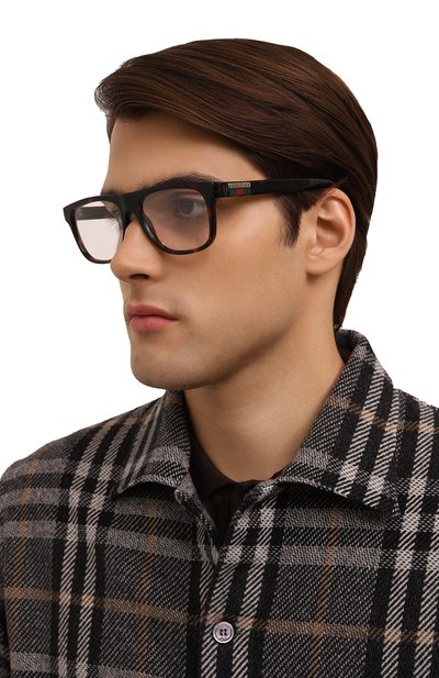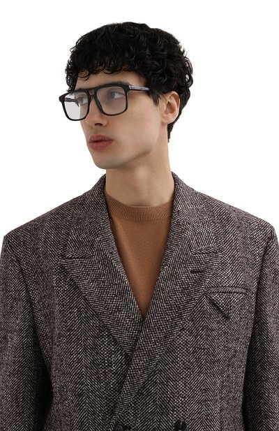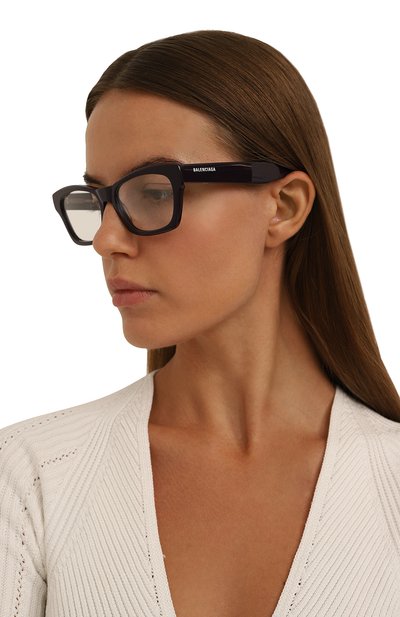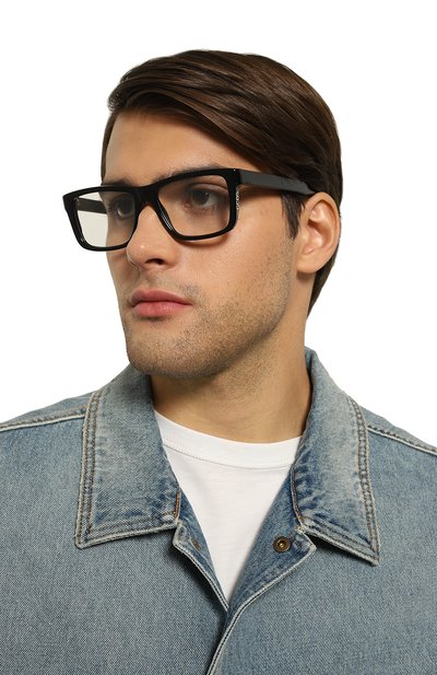 Оправу с литыми носоупорами выполнили из ацетата. Аксессуар, подходящий и мужчине, и женщине, дополнили широкими дужками, украшенными едва заметным логотипом.