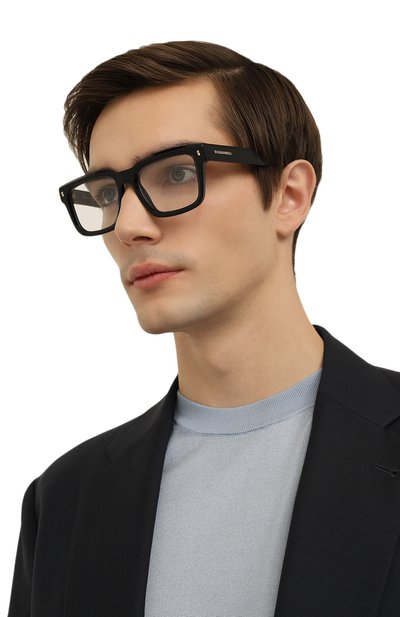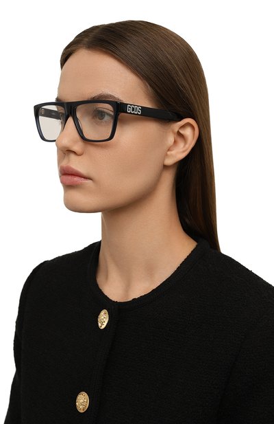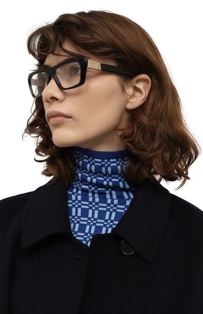 Лаконичная черная оправа с прямоугольной рамкой будет уместна как в женских, так и мужских образах. Для создания аксессуара использовали гладкий прочный ацетат, отполированный до глянцевого блеска. Принадлежность бренду обозначили металлическими аппликациями-логотипами на дужках.