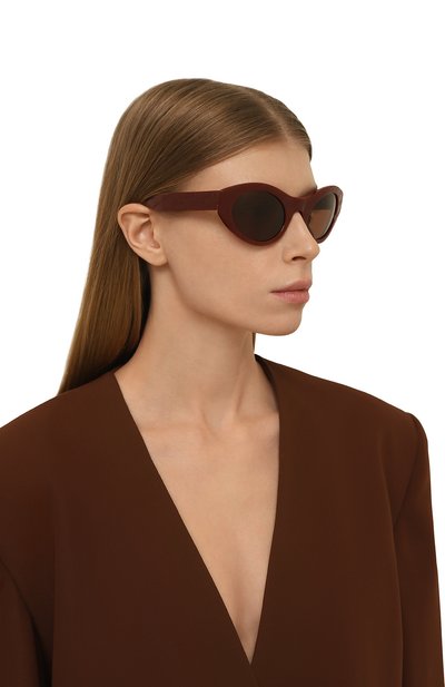 Коричневые солнцезащитные очки с черепаховым узором изготовили из легкого прочного ацетата. Место крепления широких дужек декорировали вставками с логотипом бренда. Заушники подчеркнули узкими полосами. Затемненные розовые линзы обеспечивают надежную защиту от воздействия УФ-лучей.
