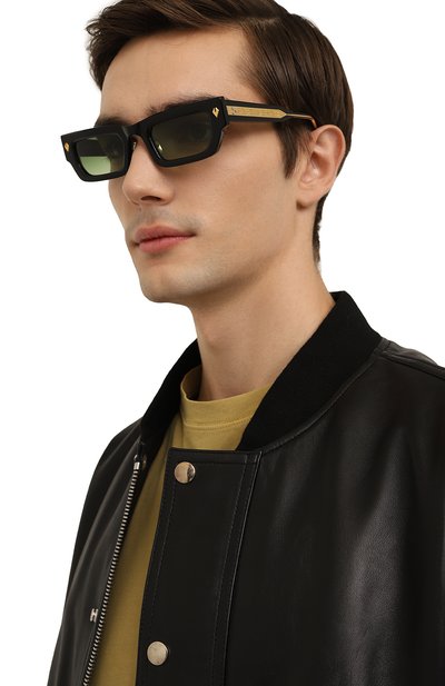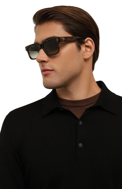 Солнцезащитные очки с оправой из полупрозрачного ацетата украшены фирменными эмалевыми заклепками из стерлингового серебра. Изогнутые дужки дополнены титановыми вставками и сверхпрочными семицилиндровыми шарнирами. На градиентные линзы нанесено антибликовое и устойчивое к царапинам покрытие.