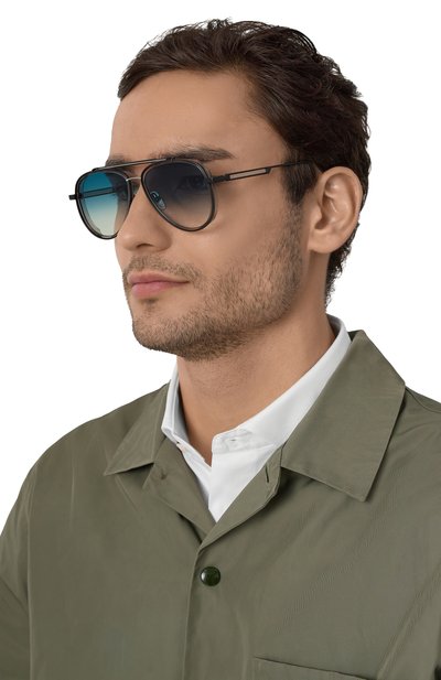 Очки с фигурной рамкой поддержат как женские, так и мужские образы. Для создания оправы использовали титан с матовым покрытием и глянцевый японский ацетат Takiron. Градиентные линзы на 100% защищают глаза от ультрафиолета.