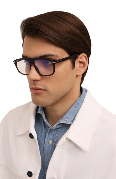Квадратную черепаховую оправу выполнили из прочного гладкого ацетата. Аксессуар с фирменными Т-образными креплениями дополнили линзами с покрытием blue-block, блокирующим лучи синего спектра.