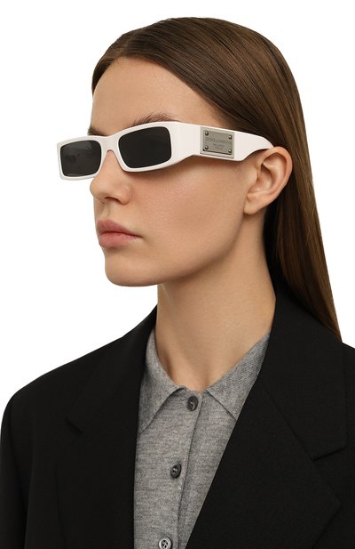 Солнцезащитные очки из ацетата будут органично смотреться и на мужском, и на женском лице. Дужки аксессуара с дымчатыми линзами украсили объемной монограммой DG на фоне полупрозрачных вставок.