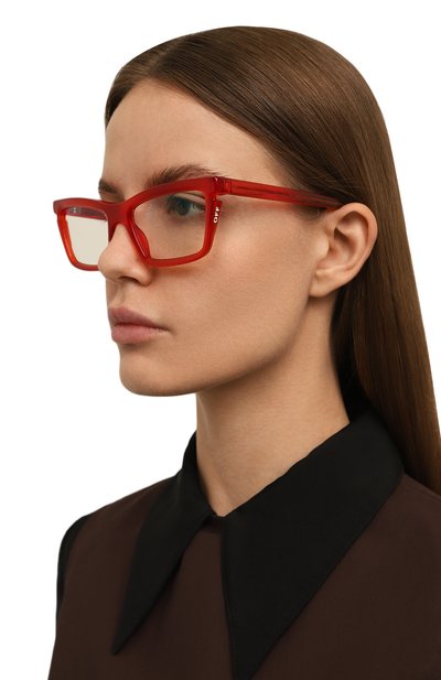 Яркая оправа сможет стать акцентной деталью в образе. Для изготовления аксессуара формы cat eye использовали ацетат. На дужках — серебристые вставки с рельефной монограммой DG.