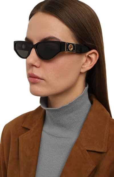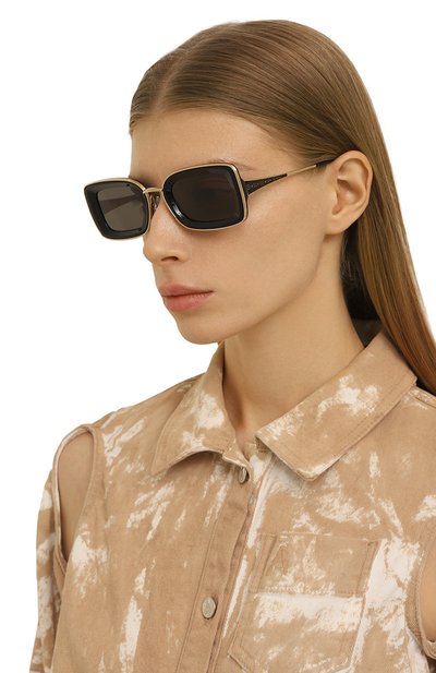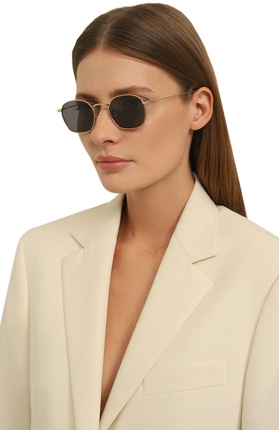 О принадлежности очков бренду напоминает небольшой логотип на дужках. Фирменную символику повторили на одной из геометричных линз категории затемнения 3N, полностью блокирующих ультрафиолет. Аксессуар с узкой металлической оправой дополнили полимерными заушниками с черепаховым узором.