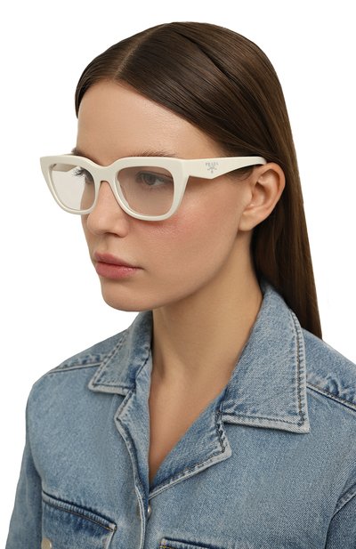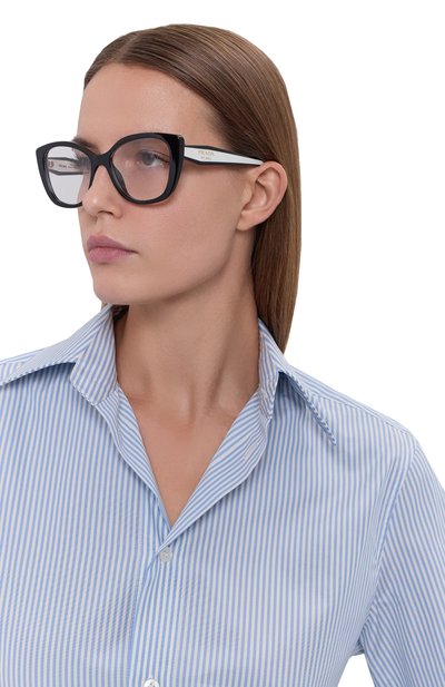 Оправу формы cat eye изготовили из полупрозрачного ацета та. Усиленные металлическими вставками дужки украсили рельефными логотипами.