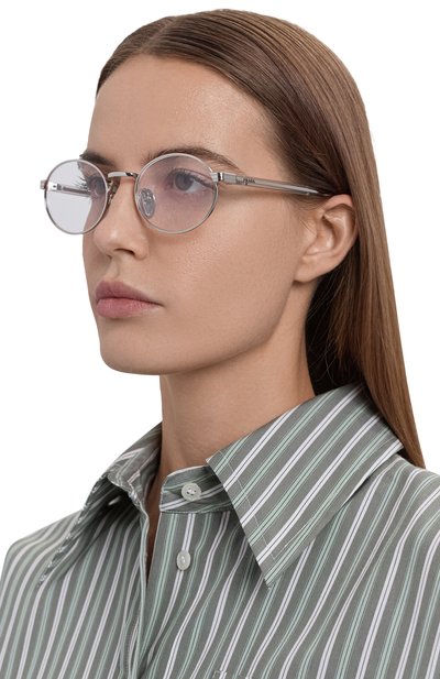 Оправу формы cat eye изготовили из полупрозрачного ацетата. Усиленные металлическими вставками дужки украсили рельефными логотипами.