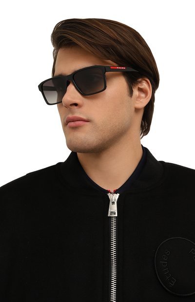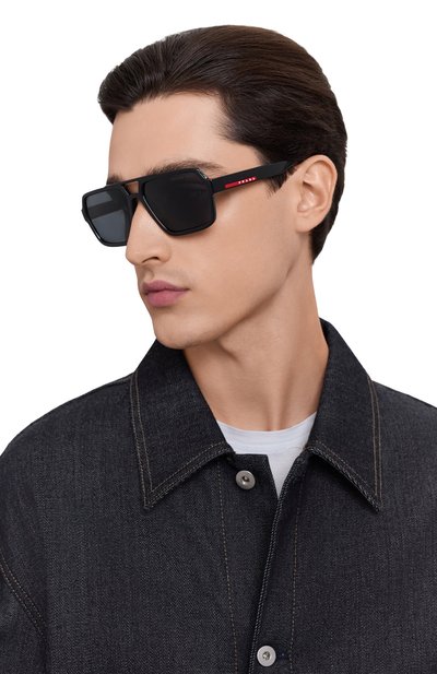 Солнцезащитные очки прямоугольной формы изготовили из ацетата. Аксессуар дополнили линзами из устойчивого к царапинам поликарбоната, полностью блокирующими УФ-лучи. Дужки украсили красной вставкой с логотипом Prada Linea Rossa.