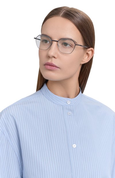 Оправу с контрастным контуром выполнили из почти невесомого ацетата. Принадлежность марке подчеркнули серебристым логотипом на дужках с фирменными треугольниками.