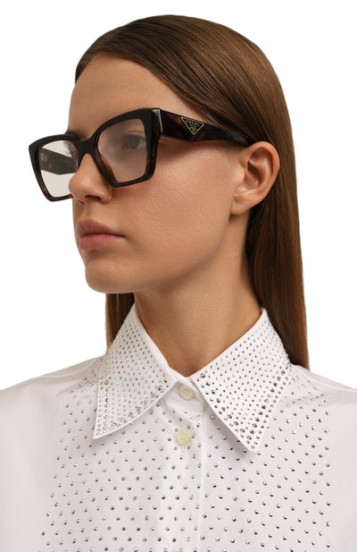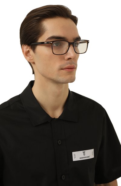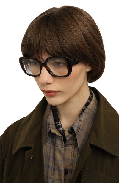 Оправу из черепахового ацетата украсили треугольником с логотипом на усиленных металлическими вставками дужках. Почти невесомый аксессуар квадратной формы подойдет и для мужского, и для женского лица.