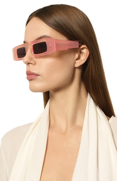 Солнцезащитные очки выполнили из полупрозрачного ацетата. Дужки, в которых угадывается силуэт фирменного треугольника, армировали и украсили логотипом бренда. Модель на 100% защищает от UVA и UVB-лучей.
