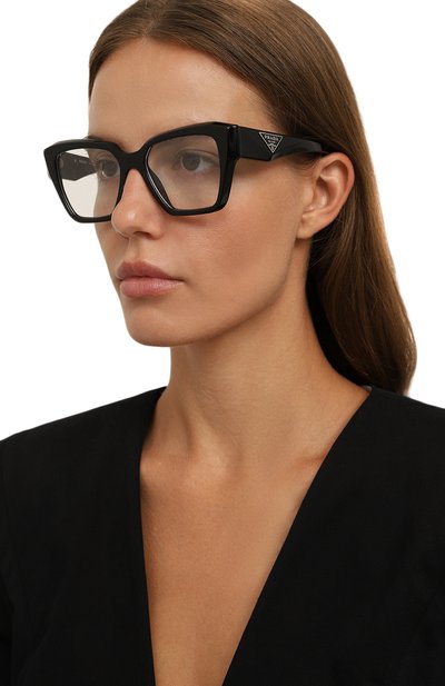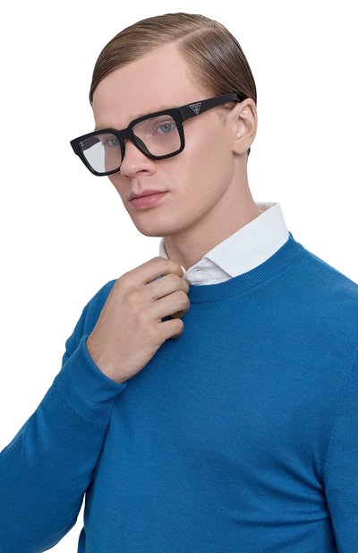 Пр ямоугольная оправа будет уместна в образах любой формальности и палитры. Аксессуар из глянцевого ацетата украшен логотипами на дужках, усиленных металлическими вставками.