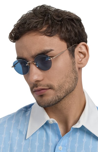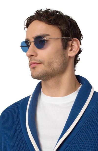 Безободковую оправу овальных очков из коллекции HardWear выполнили из металла. Дужки аксессуара с подвижными прозрачными носоупорами украсили деталью в виде звеньев, как на браслетах из архива 1962 года. Модель с линзами, полностью блокирующими ультрафиолет, дополнили ацетатными заушниками с наконечниками фирменного оттенка Tiffany Blue®.