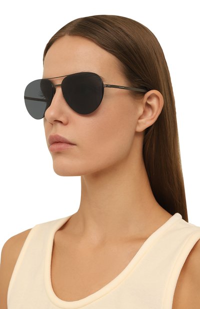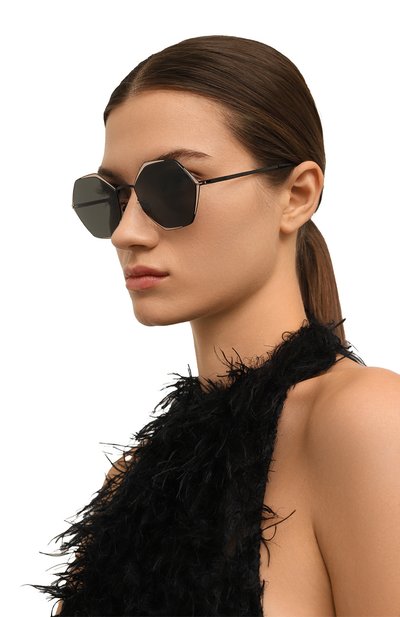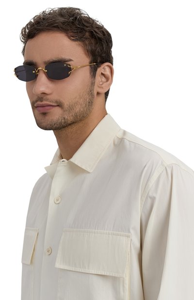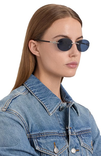 Безободковую оправу овальных очков выполнили из металла с золотистым покрытием, а дужки с наконечниками оттенка Tiffany Blue и фирменными креплениями – из гладкого ацетата. Модель с подвижными носоупорами оснастили темными линзами, полностью блокирующими ультрафиолет.