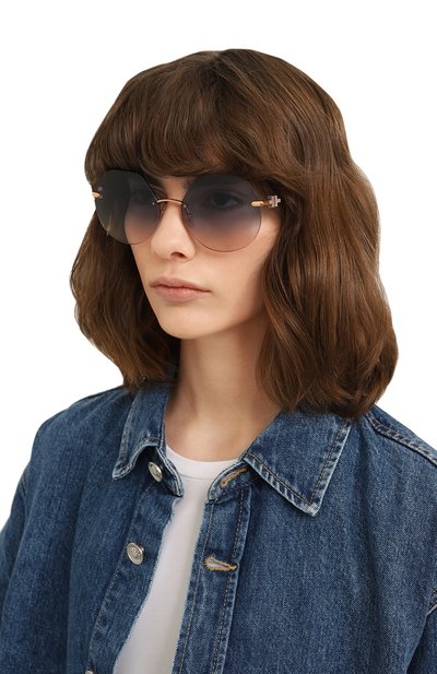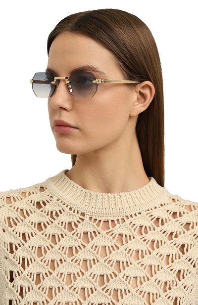 Безободковые солнцезащитные очки с градиентными антибликовыми линзами выполнены из металла с золотистым финишем. Узкие дужки из ацетата дополнены звеньями, вдохновленными фирменными ювелирными изделиями.