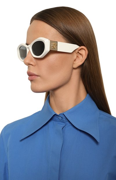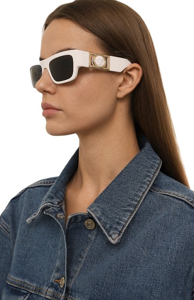 Солнцезащитные очки из глянцевого ацетата украсили золотистыми вставками и накладкой Medusa на широких дужках. Аксессуар формы cat eye дополнили линзами со степенью затемнения 3N, не снижающими контрастность изображений.