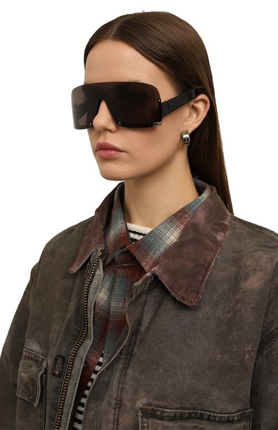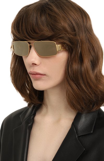 Очки с шестиугольной узкой рамкой изготовили из металла с золотистым гальваническим покрытием. Ацетатные дужки дополнили брендированными вставками и петлями для крепления входящей в комплект цепочки. Зеркальные линзы на 100% защищают глаза от UV лучей.