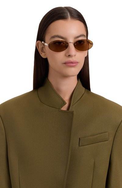 Солнцезащитные очки с ромбовидными линзами на 100% защищают глаза от UVA/UVB лучей и не снижают контрастность изображения. Аксессуар с выступающей снизу рамкой и монограммой GG на узких дужках изготовили из металла с золотистым гальваническим покрытием.