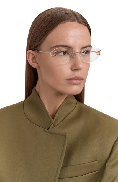 Металлическая оправа с тонкими ободами формы cat eye вошла в коллекцию Panthere de Cartier. Узкие дужки с контрастными заушниками украсили барельефом пантеры.
