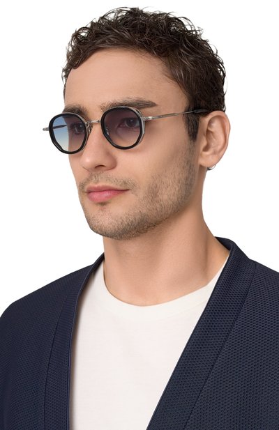 Солнцезащитные очки выполнили из посеребренного металла, отделку ободов и заушников — из ацетата. Градиентные линзы CR39 с AR-обработкой защищают от ультрафиолета.