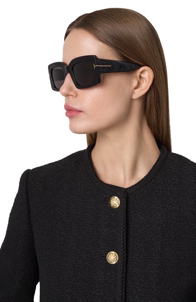 Для изготовления квадратных солнцезащитных очков из линии Esme использовали легкий ацетат. Модель с брендированными деталями на фигурных дужках дополнили дымчатыми линзами, блокирующими ультрафиолет.
